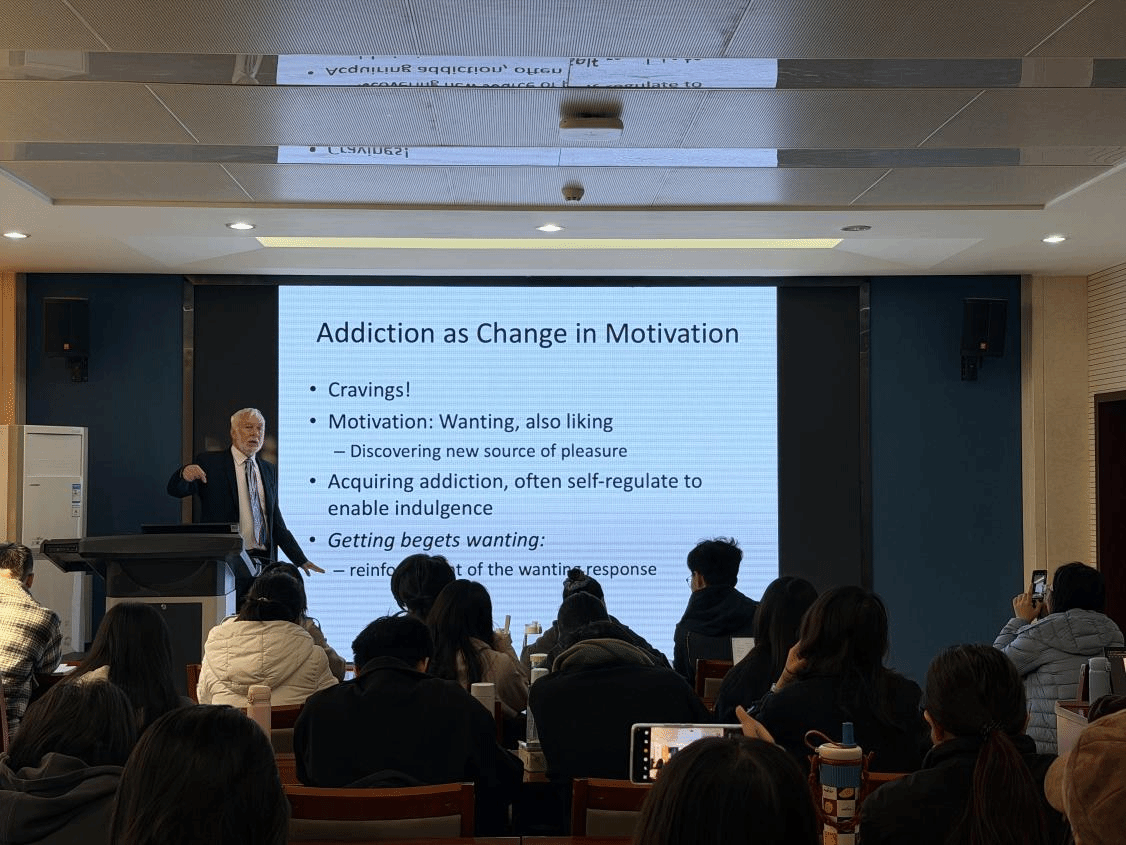 在交流期间,Baumeister 教授围绕自我控制与自我损耗、社会认知与行为、文化适应等主题,为师生开设了多场高水平学术讲座与工作坊。系列讲座以自我与社会关系为主线,系统梳理了其团队在社会行为、人格健康、成瘾行为、自我控制以及个体与文化适应等领域的连续性工作,揭示了人格、社会文化与心理健康之间的复杂关系。从积极心理学与心理健康的综合视角出发,Baumeister 教授开展了“社会排斥及其心理影响”、“性别的演化视角”、“自我损耗的心理机制”、“自我控制与意志力系统”、“文化对行为的塑造”等主题讲座,深入阐释了个体在行为决策中受到的情绪负荷、自我资源限制与文化意义框架的共同影响,并通过自我控制与损耗的系列研究,展示了自我资源在心理健康中的关键地位。讲座现场学术氛围浓厚,互动热烈,参会师生围绕自我调节机制、社会适应与文化差异等问题与教授展开交流与对话,不断反思本土心理学研究与国际前沿的衔接路径