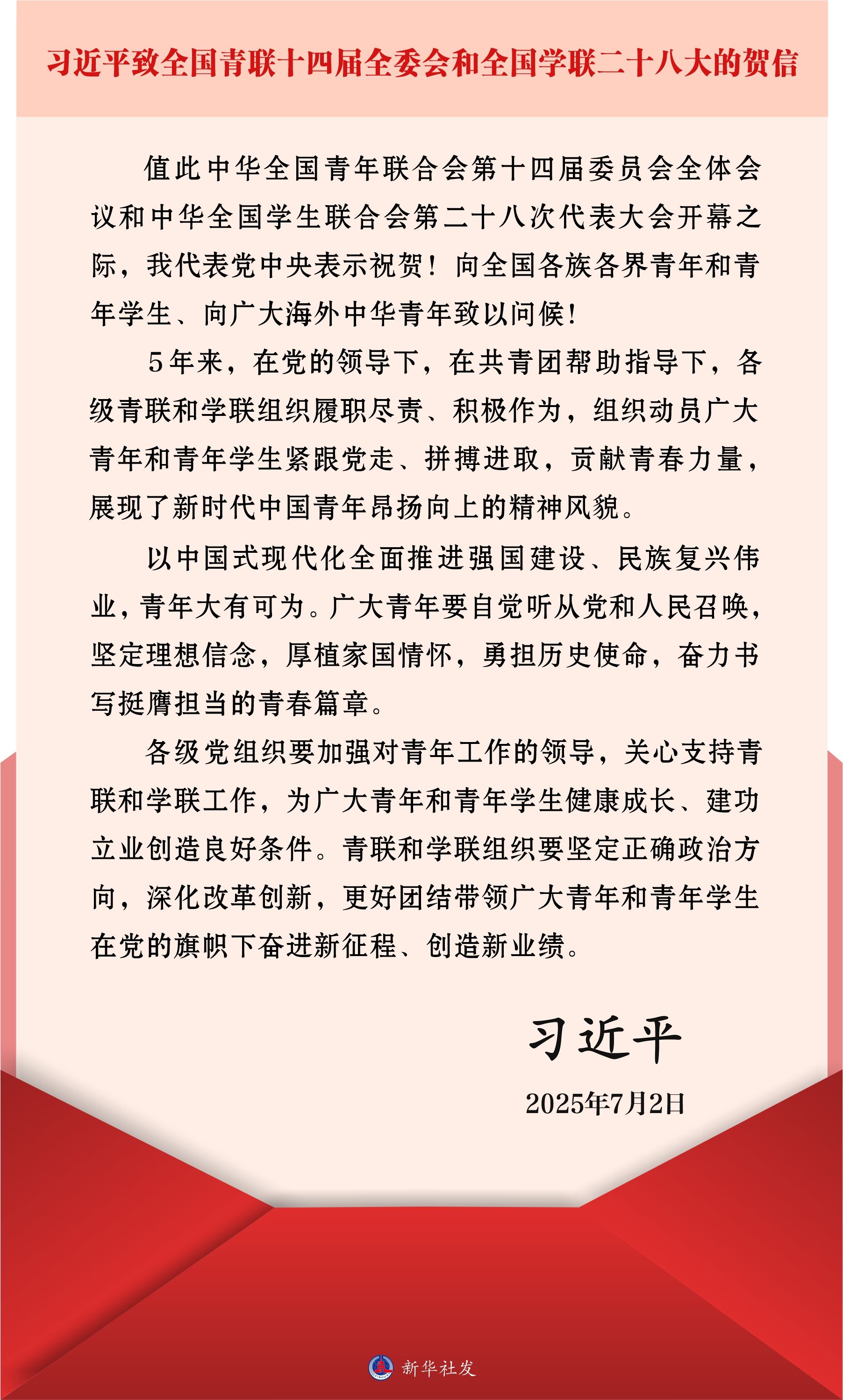 新华社北京7月2日电 中华全国青年联合会第十四届委员会全体会议、中华全国学生联合会第二十八次代表大会2日上午在京开幕。中共中央总书记、国家主席、中央军委主席习近平发来贺信,代表党中央表示祝贺,向全国各族各界青年和青年学生、向广大海外中华青年致以问候。